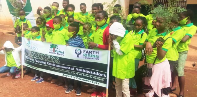 After receiving lessons on different climate change challenges in their communities and understanding the role they can play in global fight against climate change, some 50 kids from communities within the Bamenda Highlands were recently engaged in planting trees in public spaces in Bamenda town, and radio sensitization campaign. Organised within the framework of the Climate Action Project dubbed Ecokids implemented by Voice of Nature (VoNat) and Meg Wah with funding from Earth Rising Foundation, the youngsters  planted both ornamental  and economic trees including terminalia (Terminalia ivorensis), grevillea (Grevillea robusta) and guavas (Psidium guajava) in churches and hospitals around their communities.